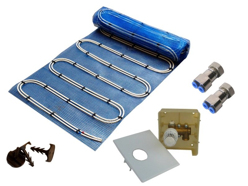 Die Heizung basiert auf einem nach DIN sauerstoffdichten Rohrsystem aus Polybutylen (PB), einem hochwertigen, unverrottbaren Kunststoff. Die Rohre haben einen Durchmesser von 8mm und sind parallel in Mäanderform auf einer 80cm breiten Gewebe-Gittermatte vorverlegt.Größere Flächen erhält man durch die Kombination mehrerer Matten. Die Heizungsrohre einer oder mehrerer Matte(n) werden mittels eines entsprechenden Verteilerfingers an Vor- und Rücklauf (meist parallel zu dem nächstgelegenen Heizkörper) angeschlossen. Die Wassertemperatur des Systems wird über ein Rücklauftemperaturbegrenzer-Ventil (RTL) mit integriertem Fühler im Rücklauf geregelt.