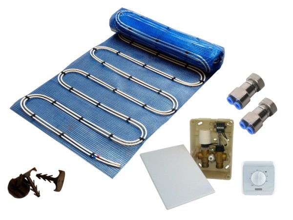 Die Heizung basiert auf einem nach DIN sauerstoffdichten Rohrsystem aus Polybutylen (PB), einem hochwertigen, unverrottbaren Kunststoff. Die Rohre haben einen Durchmesser von 8mm und sind parallel in Mäanderform auf einer 80cm breiten Gewebe-Gittermatte vorverlegt.Größere Flächen erhält man durch die Kombination mehrerer Matten. Die Heizungsrohre einer oder mehrerer Matte(n) werden mittels eines entsprechenden Verteilerfingers an Vor- und Rücklauf (meist parallel zu dem nächstgelegenen Heizkörper) angeschlossen. Die Wassertemperatur des Systems wird über ein Rücklauftemperaturbegrenzer-Ventil (RTL) mit integriertem Fühler im Rücklauf geregelt.