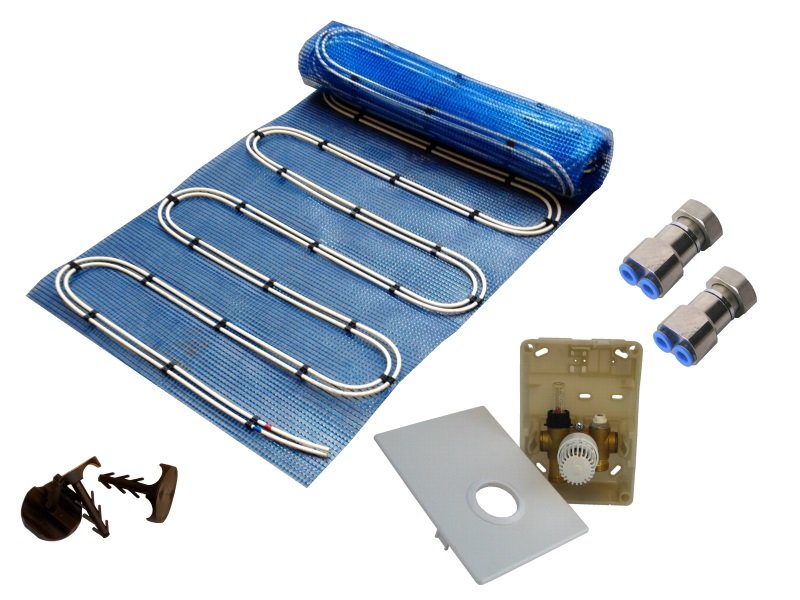 Die Heizung basiert auf einem nach DIN sauerstoffdichten Rohrsystem aus Polybutylen (PB), einem hochwertigen, unverrottbaren Kunststoff. Die Rohre haben einen Durchmesser von 8mm und sind parallel in Mäanderform auf einer 80cm breiten Gewebe-Gittermatte vorverlegt.Größere Flächen erhält man durch die Kombination mehrerer Matten. Die Heizungsrohre einer oder mehrerer Matte(n) werden mittels eines entsprechenden Verteilerfingers an Vor- und Rücklauf (meist parallel zu dem nächstgelegenen Heizkörper) angeschlossen. Die Wassertemperatur des Systems wird über ein Rücklauftemperaturbegrenzer-Ventil (RTL) mit integriertem Fühler im Rücklauf geregelt.