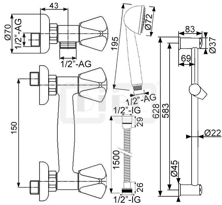 DIBL'classic Zweigriff-Brausebatterie zur Aufputzmontage, mit Brausestange 628 mm