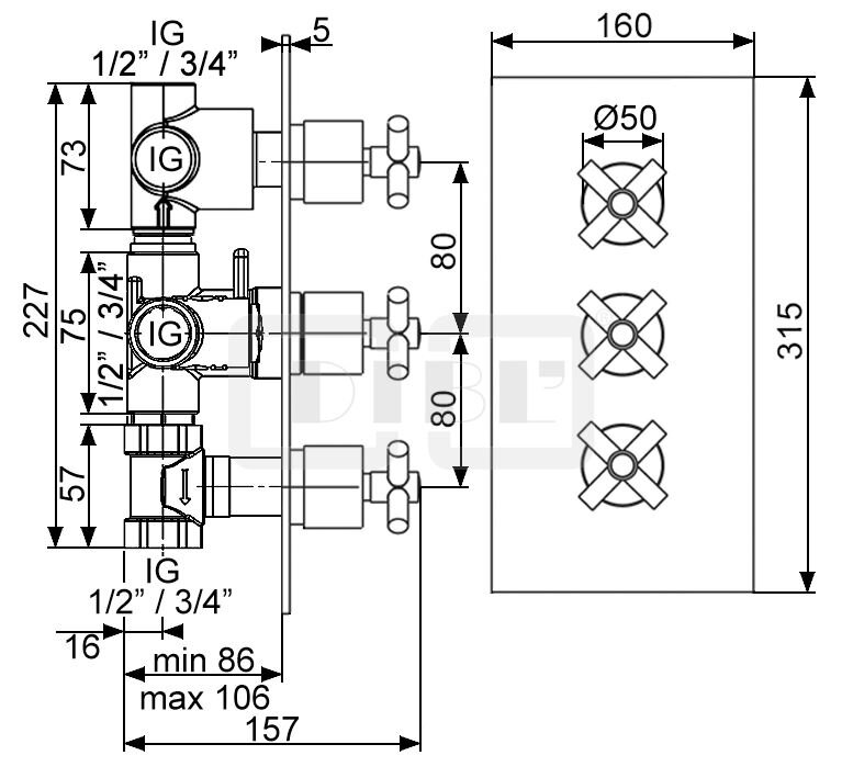 DIBL'extra Thermostat-Batterie ½" zur Unterputzmontage, mit integriertem Mehr-Wege-Umschaltventil für zwei Abgangsanschlüsse