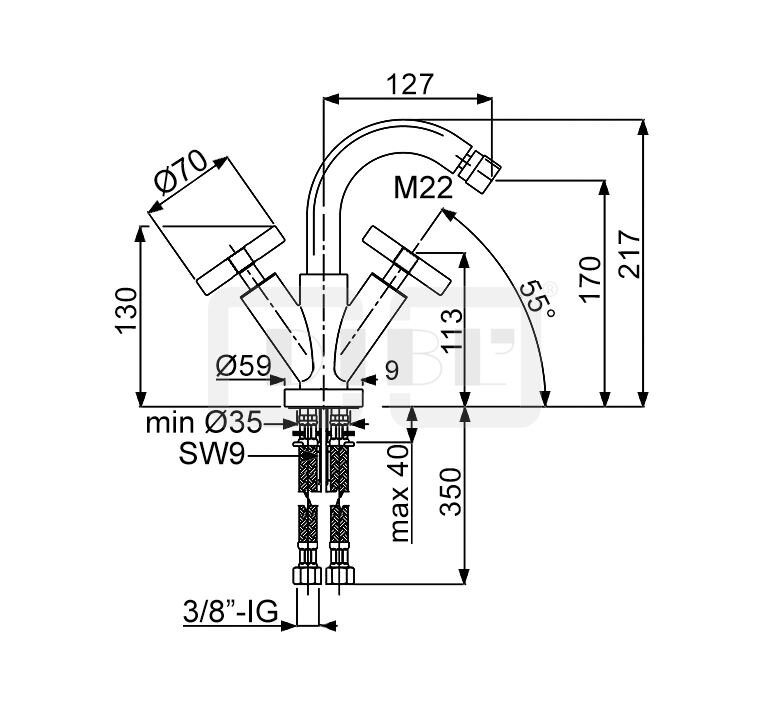 DIBL'extra Zweigriff-Bidetbatterie mit hohem, schwenkbarem Gussauslauf, ohne Zugstangenbohrung, ohne Ablaufzubehör