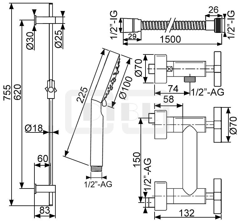 DIBL'extra Zweigriff-Brausebatterie zur Aufputzmontage, mit Messing-Brausestange 755 mm, Handbrause und Metallbrauseschlauch 1500 mm
