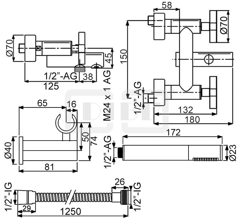 DIBL'extra Zweigriff-Wannenbatterie zur Aufputzmontage, mit Stabhandbrause, Wandbrausehalter und Metallbrauseschlauch 1250 mm