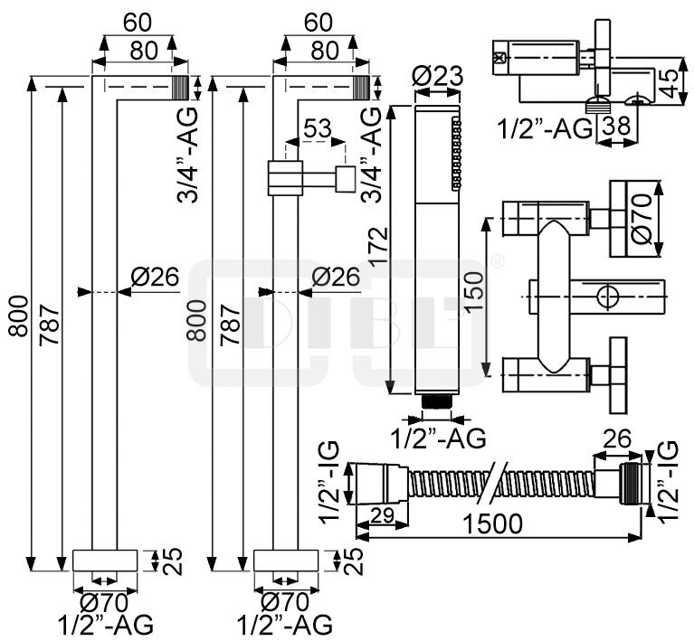 DIBL'extra Zweigriff-Wannenbatterie zur freistehenden Bodenmontage im Raum, mit Stabhandbrause und Metallbrauseschl. 1500 mm