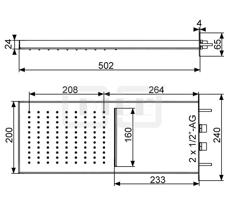 DIBL'fit Eckige Antikalk-Kopfbrause 502 mm x 200 mm x 24 mm zur Wandmontage, mit Regenstrahl und Cascaden-Schwallstrahl
