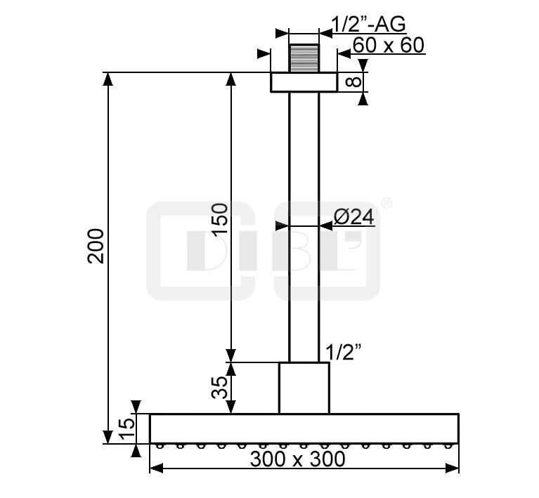 DIBL'fit Eckige Messing-Antikalk-Regenkopfbrause 300 mm x 300 mm x 15 mm, mit Messing-Deckenanschlussarm Ø 24 mm mit ½" AG x ½" AG
