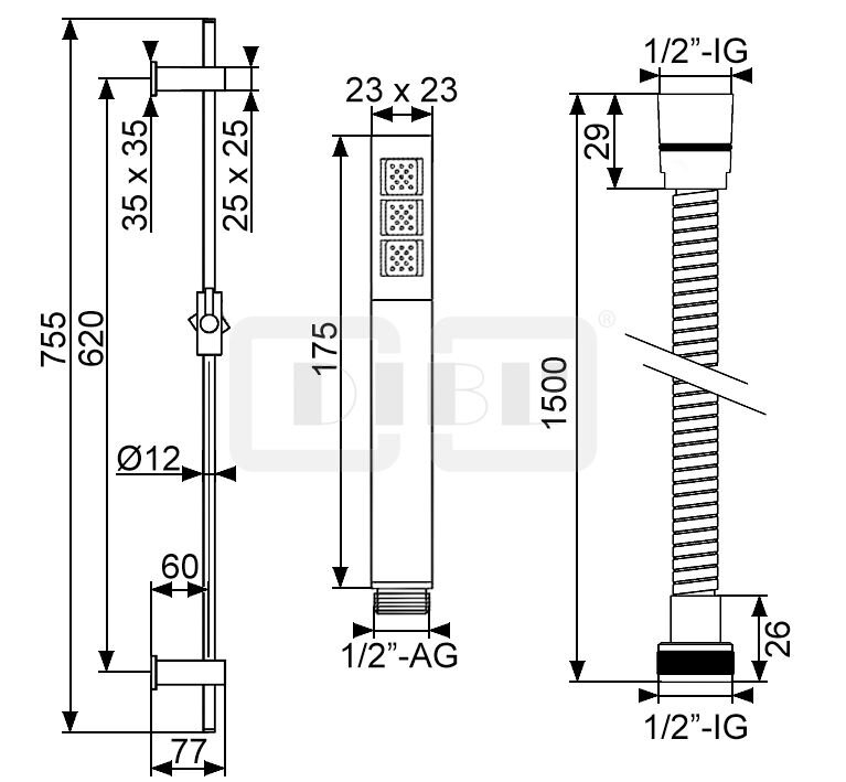 DIBL'fit Eckige Messing-Brausegarnitur mit rundem Brauserohr Ø 12 mm x 755 mm, Stabhandbrause, Metallbrauseschlauch 1500 mm