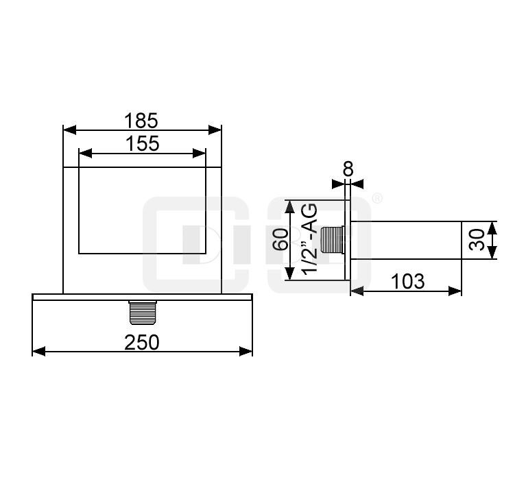 DIBL'fit Eckige Messing-Kopfbrause 250 mm x 111 mm x 60 mm zur Wandmontage, mit Cascaden-Schwallstrahl