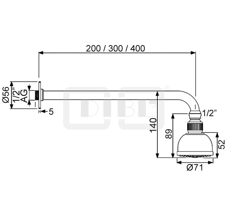 DIBL'fit Kunststoff-Einstrahl-Antikalk-Kopfbrause Ø 71 mm x 52 mm, mit 90°-Messing-Wandanschlussarm, Länge 200 mm