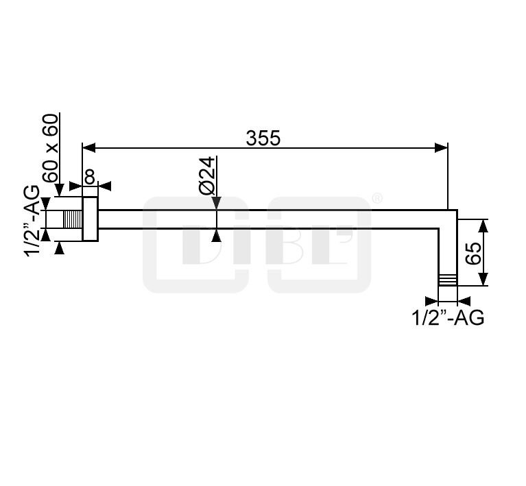 DIBL'fit Massiver 90°-Messing-Wandanschlussarm, mit eckiger Messing-Schubrosette, Ausladung 355 mm