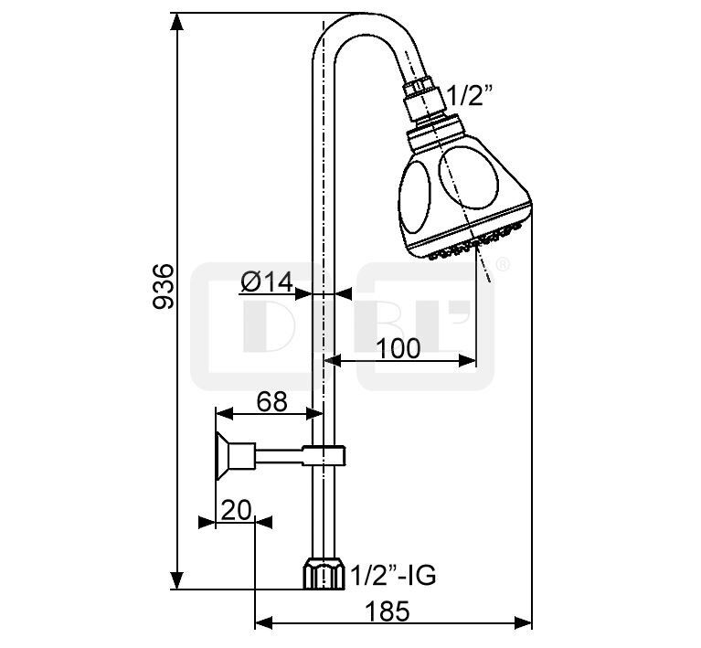 DIBL'fit Messing-Brause-Steigrohr Ø 14 mm x 936 mm, mit variabler Wandhalterung und mit Einstrahl-Antikalk-Kopfbrause