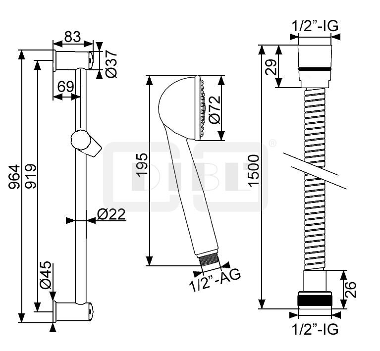DIBL'fit Projekt-Brausegarnitur mit rundem Brauserohr Ø 22 mm x 964 mm