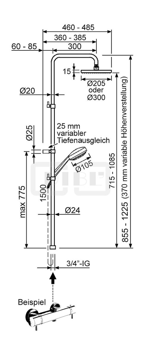 DIBL'fit Runde Brauseaufsatz-Kombination zum direkten Armaturenanschluss mit stufenloser Höhenverstellung um 370 mm, mit Handbrause, Brauseschlauch 1500 mm, Regenkopfbrause Ø 300 mm x 15 mm