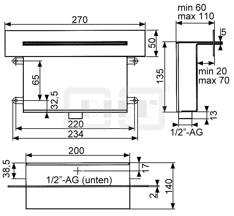 DIBL'fix Cascaden-Schwallauslauf ½" zur Unterputzmontage, mit eckiger Edelstahl-Wandrosette 270 mm x 50 mm x 2 mm