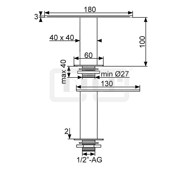 DIBL'fix Eckiger Edelstahl-Cascaden-Schwallauslauf ½" zur Wannenrandmontage, auf eckigem Standfuß