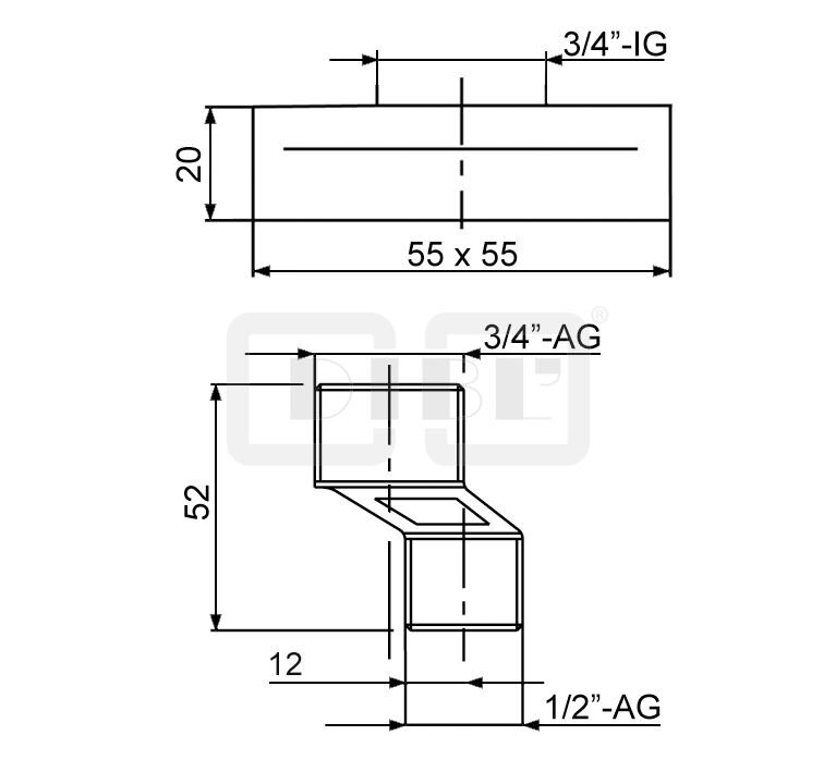 DIBL'fix S-Anschluss ½" Außengewinde x ¾" Außengewinde, mit Schalldämpfer, mit eckiger Messingguss-Design-Schraubrosette 55 mm x 55 mm x 20 mm