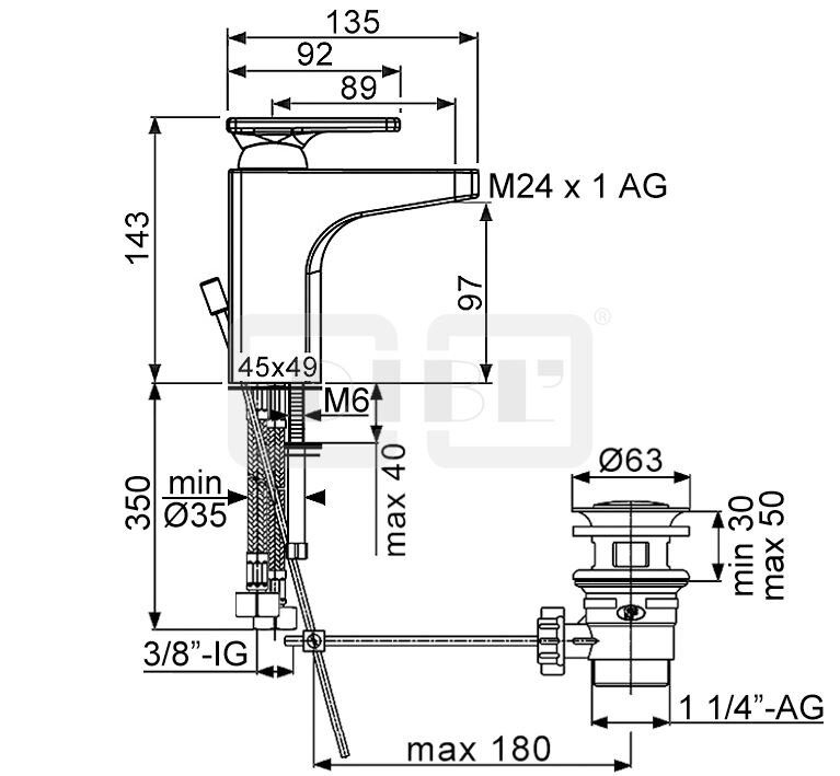 DIBL'logo Einhebel-Waschtischbatterie, Armaturenkörper mit Zugstangenbohrung und Ablaufgarnitur 1¼"