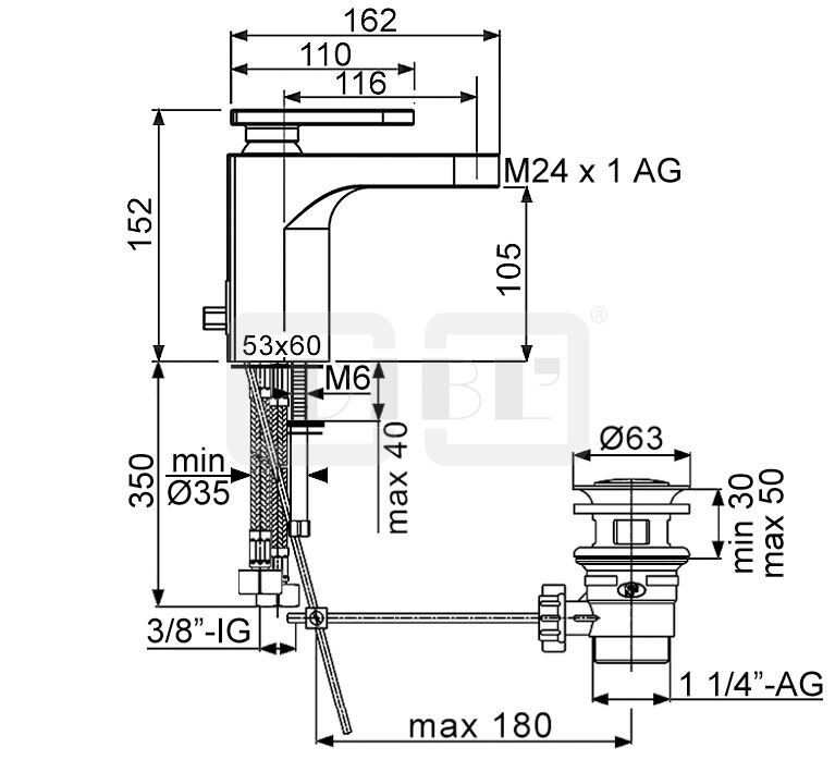 DIBL'logo Einhebel-Waschtischbatterie, XL-Version, Armaturenkörper mit Zugstangenbohrung und Ablaufgarnitur 1¼"