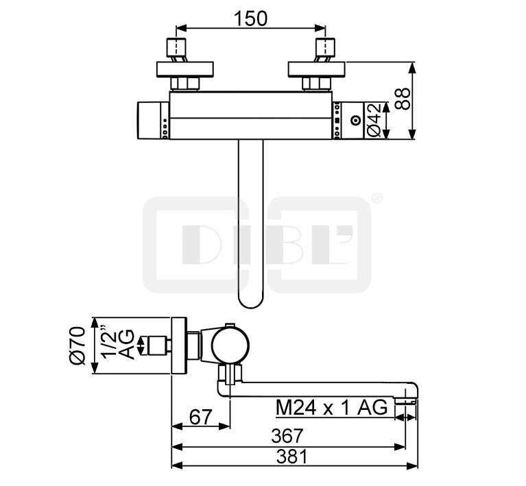 DIBL'med Thermostat-Waschtisch-Wandbatterie, mit seitlich, schwenkbarem Profilauslauf - Ausladung 300 mm, mit Vorrichtung zur manuellen, thermischen Desinfektion