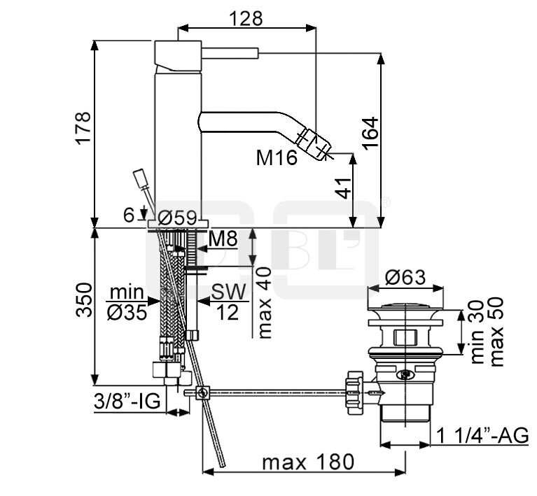 DIBL'pur Einhebel-Bidetbatterie, Armaturenkörper mit Zugstangenbohrung und Ablaufgarnitur 1¼"