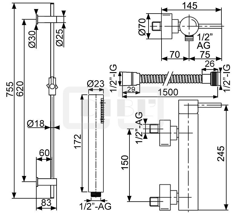 DIBL'pur Einhebel-Brausebatterie zur Aufputzmontage, mit Messing-Brausestange 755 mm, Messing-Stabhandbrause und Metallbrauseschlauch 1500 mm
