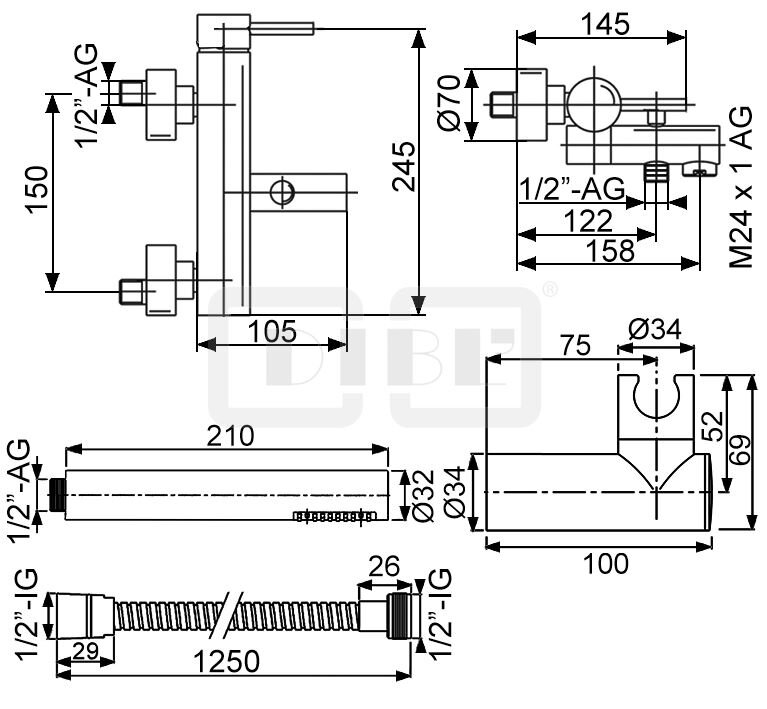 DIBL'pur Einhebel-Wannenbatterie zur Aufputzmontage, mit Stabhandbrause, mit verstellbarem Brausehalter undMetallbrauseschlauch 1250 mm