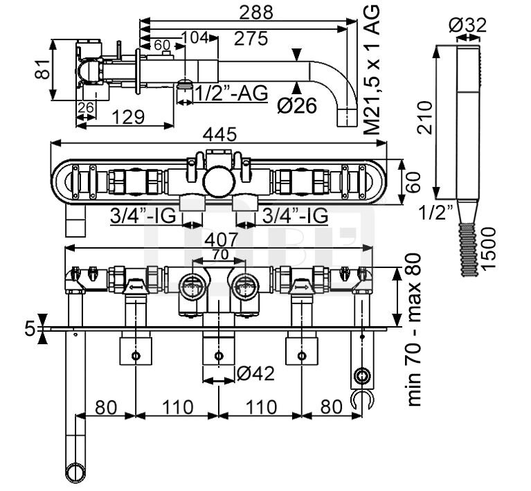DIBL'pur Thermostat-Badewannen-Einheit ¾" zur Unterputzmontage, mit zwei Regulierventilen für zwei Abgangsanschlüsse zur zeitgleichen Nutzung