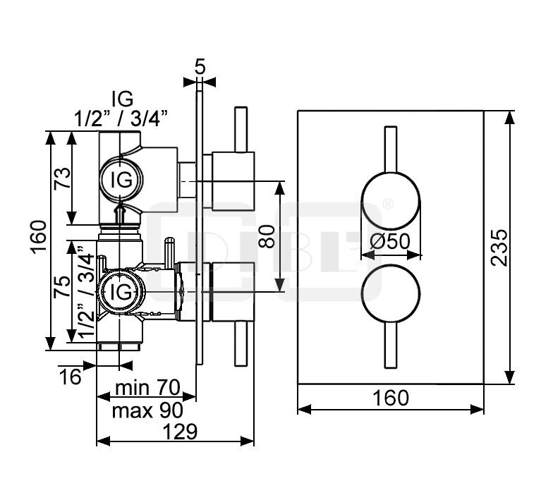 DIBL'pur Thermostat-Batterie ½" zur Unterputzmontage, mit integriertem Mehr-Wege-Umschaltventil für zwei Abgangsanschlüsse,