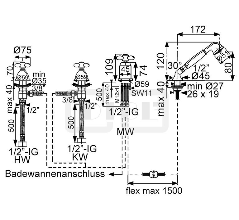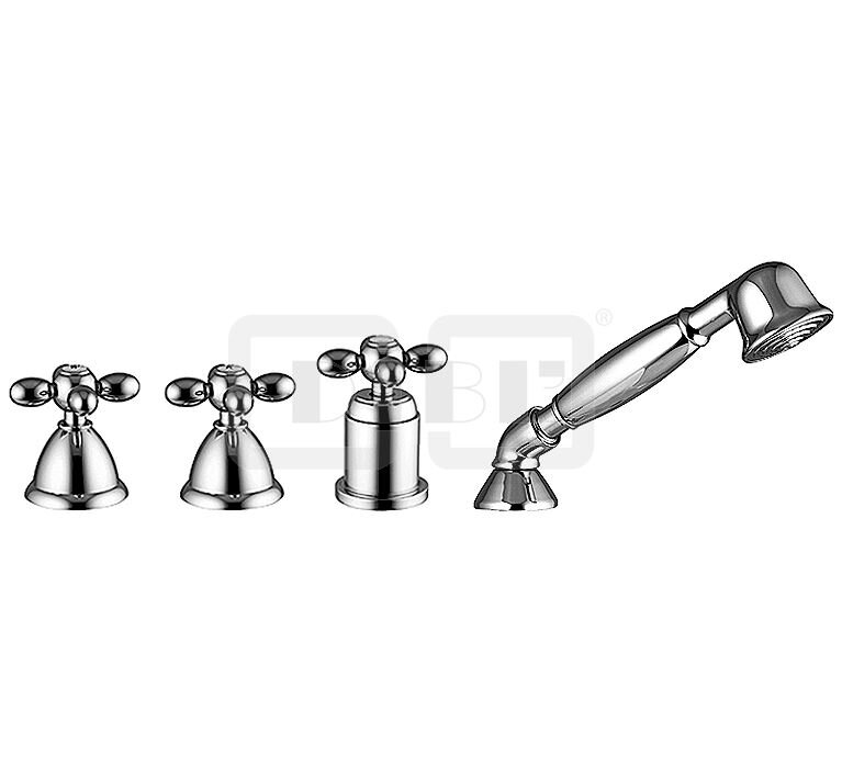 DIBL'stil Zweigriff-Vierlochbatterie zur Wannenrand- und Fliesenbankmontage, Befüllung durch die Badewannen-Ab- und Überlaufgarnitur, Schlauchbrauseset