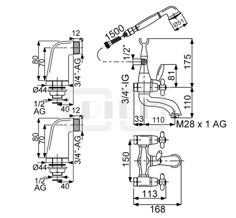 DIBL'stil Zweigriff-Wannenbatterie mit Standfüßen zur Wannenrandmontage, mit Nostalgie-Messing-Handbrause und Metallbrauseschlauch 1500 mm