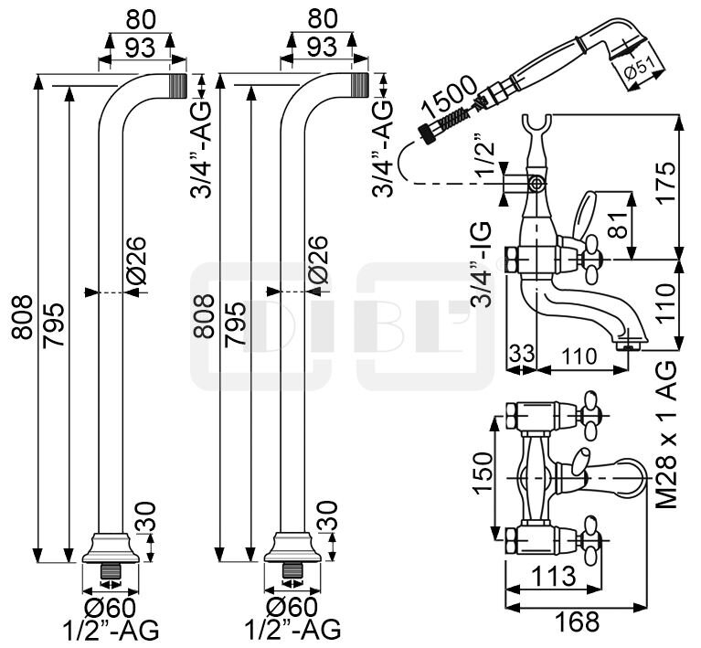 DIBL'stil Zweigriff-Wannenbatterie zur freistehenden Bodenmontage im Raum, mit Nostalgie-Messing-Handbrause und Metallbrauseschlauch 1500 mm