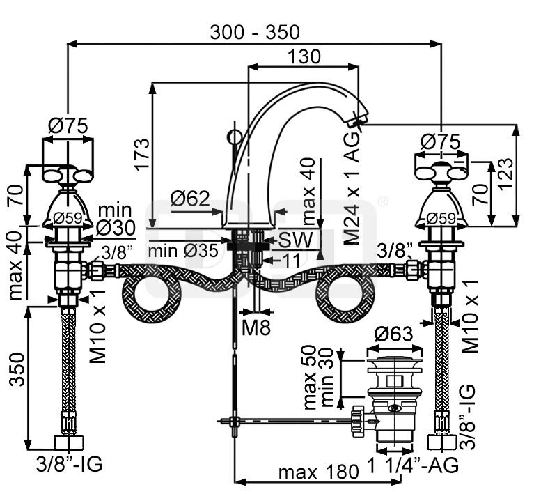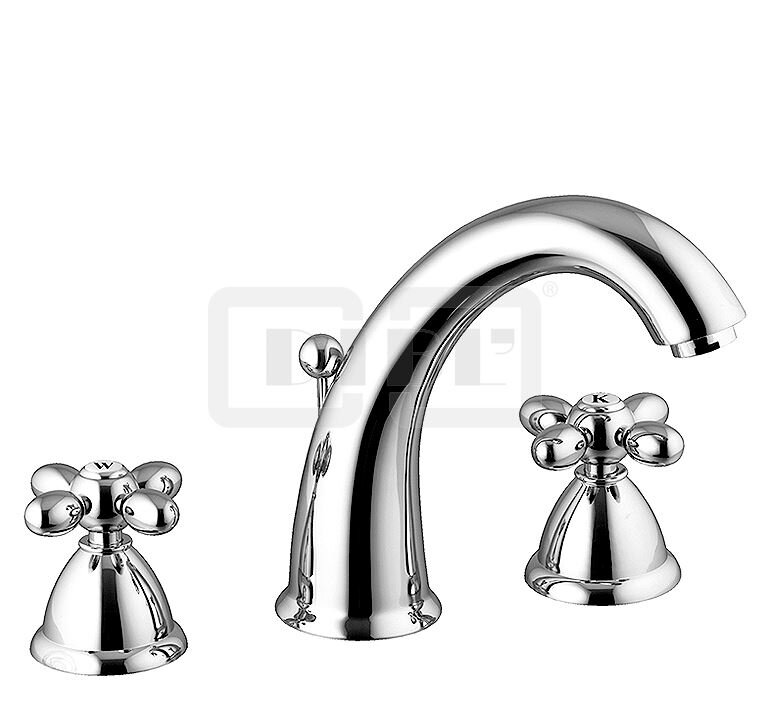 DIBL'stil Zweigriff-Waschtisch-Dreilochbatterie mit hohem, starrem Gussauslauf, mit Zugstangenbohrung und Ablaufgarnitur 1¼"