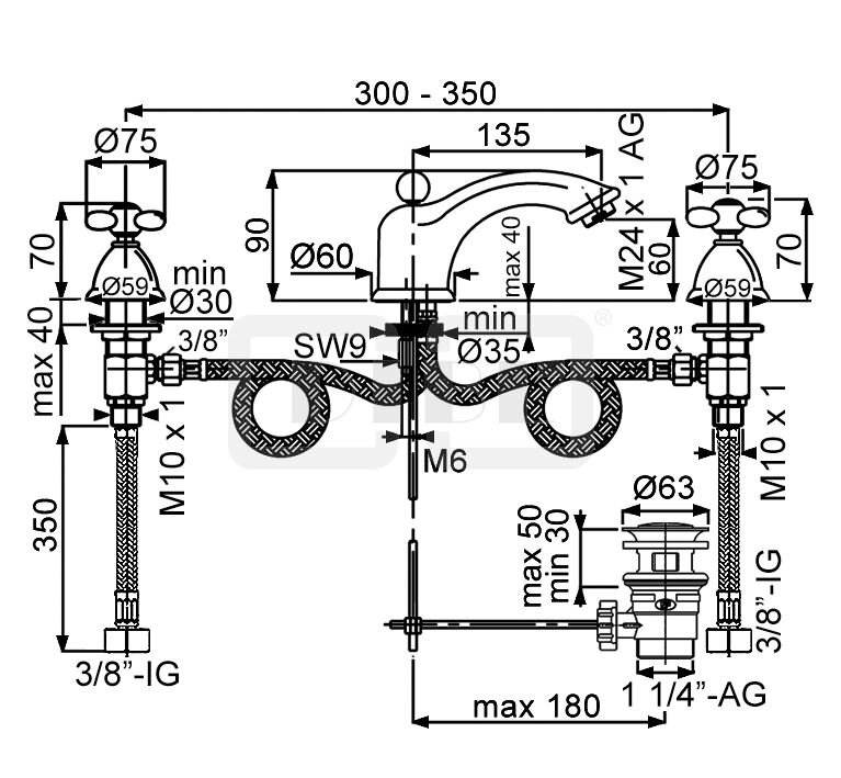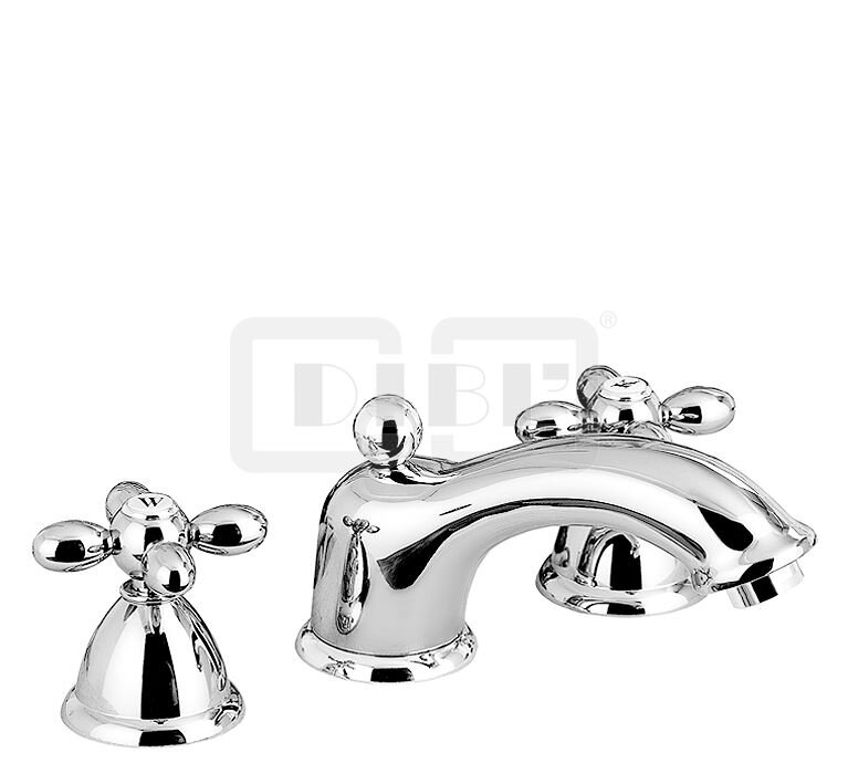 DIBL'stil Zweigriff-Waschtisch-Dreilochbatterie mit starrem Gussauslauf, mit Zugstangenbohrung und Ablaufgarnitur 1¼"