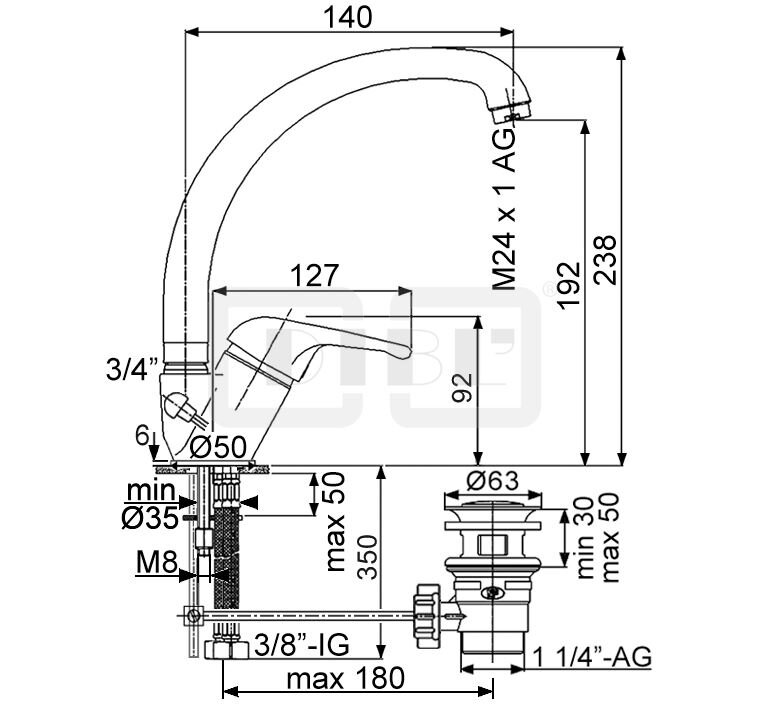 DIBL'tech Einhebel-Waschtischbatterie mit hohem, schwenkbarem Profilauslauf, mit Zugstangenbohrung und Ablaufgarnitur 1¼"