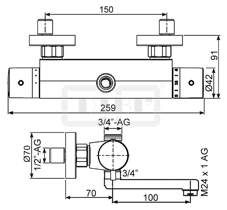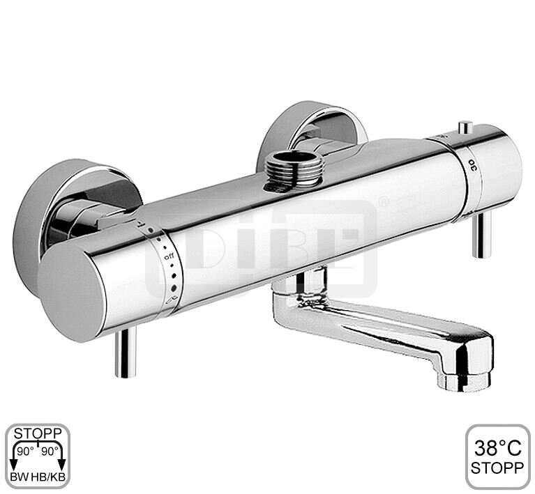 DIBL'therm eco Thermostat-Wannenbatterie zur Aufputzmontage, Brauseabgang unten ¾" Außengewinde und Brauseabgang oben ¾" Außengewinde, mit schwenkbarem Profilauslauf - Ausladung 100 mm
