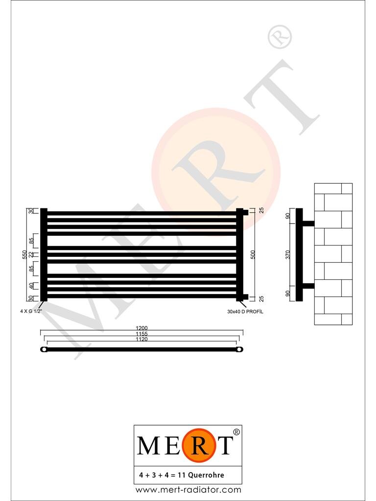 MERT Austausch Badheizkörper weiß gerade, 1200*550 mm, Anschluss an der Seite 500 mm