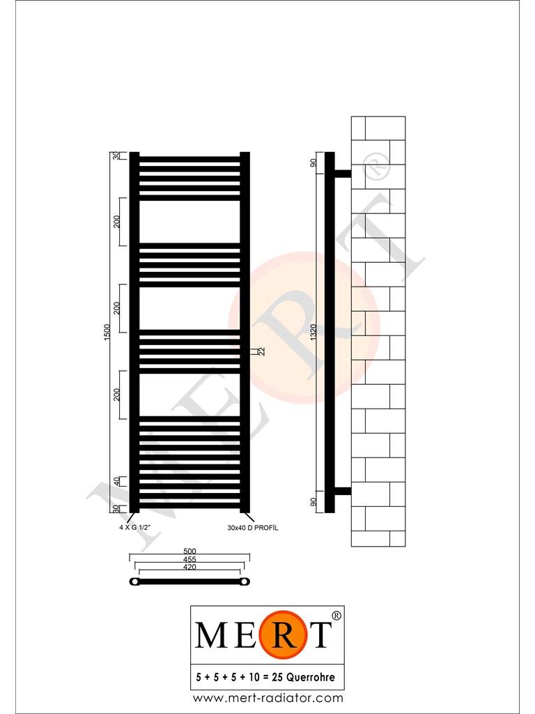 MERT Austausch Badheizkörper weiß gerade, 500*1500 mm, Standard re/li Anschluss (KEIN Mittelanschluss)