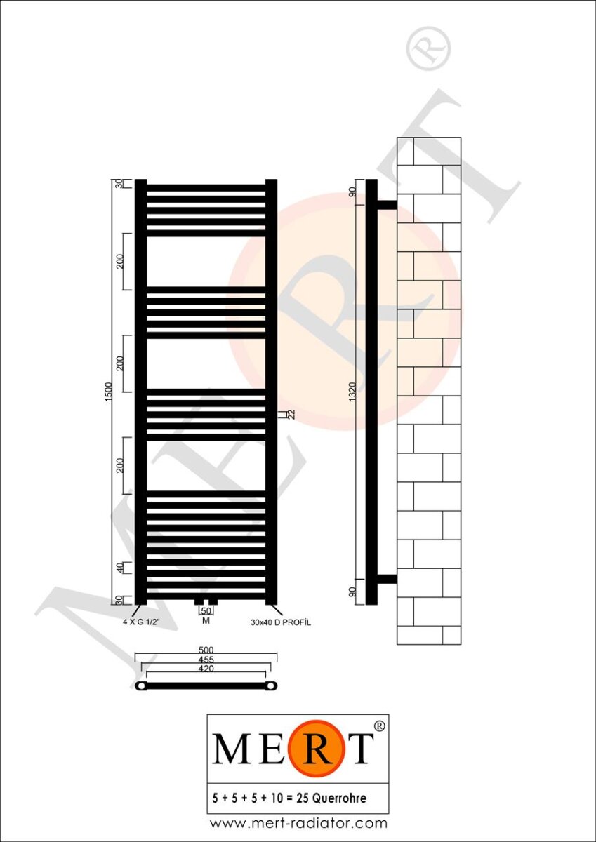 MERT Badheizkörper Chrom gerade, 500*1500 mm, Mittelanschluss