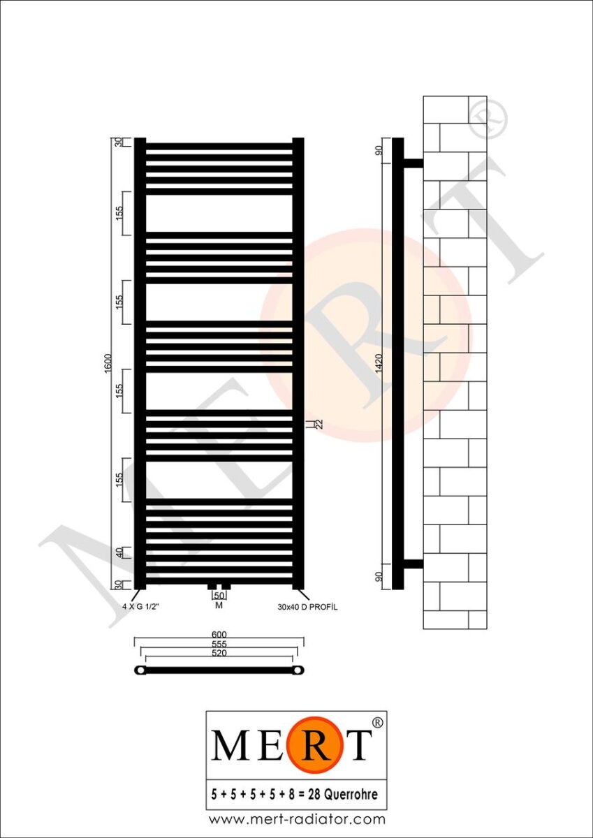 MERT Badheizkörper weiß gebogen, 600*1600 mm, Mittelanschluss