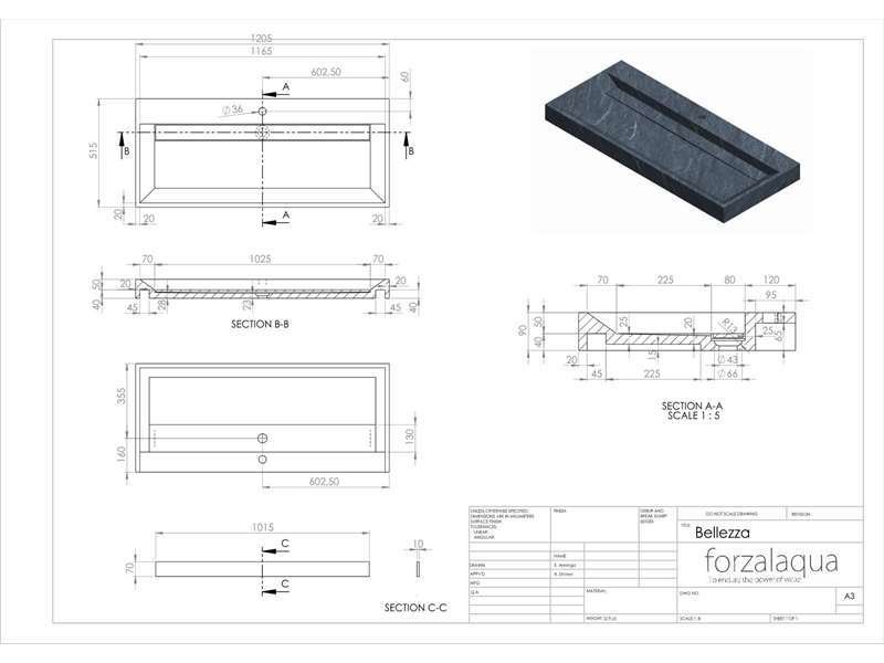 Naturstein-Waschtisch BELLEZZA Bluestone, matt geschliffen, 120,5 x 51,5 x 9 cm, mit Hahnloch